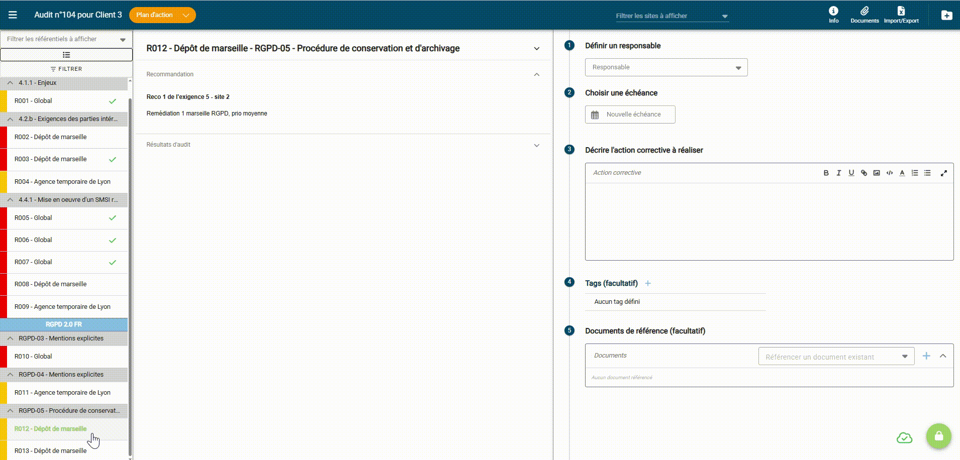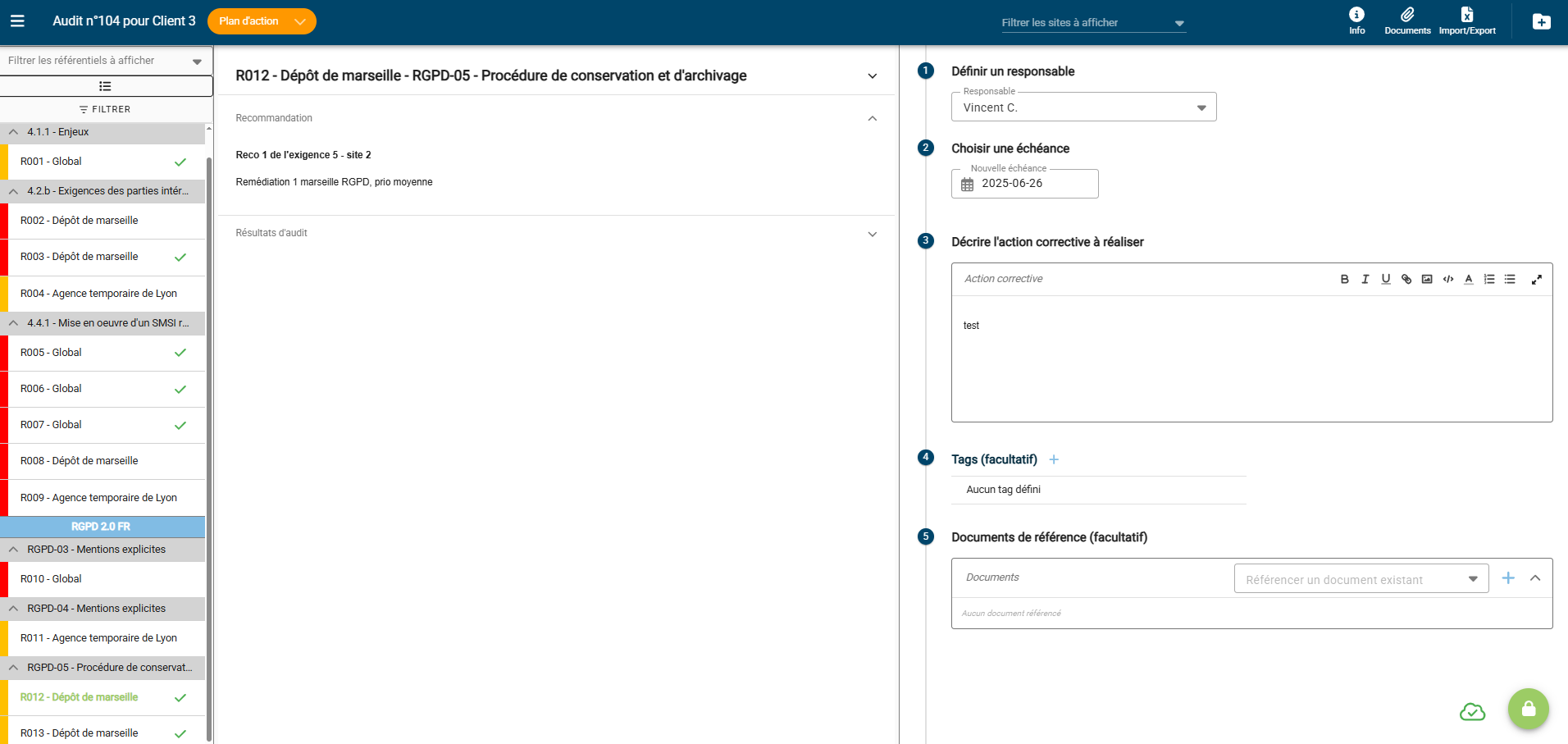 • Enregistrement automatique de la date de clôture d’un plan d’action dans la vue de gestion des audits.