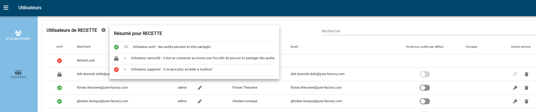• Pour vous offrir une vision plus claire de la gestion des accès, une nouvelle icône d’information a été ajoutée dans la page de gestion des utilisateurs. Elle vous permet de visualiser en un clic le nombre d’utilisateurs actifs, désactivés et supprimés.