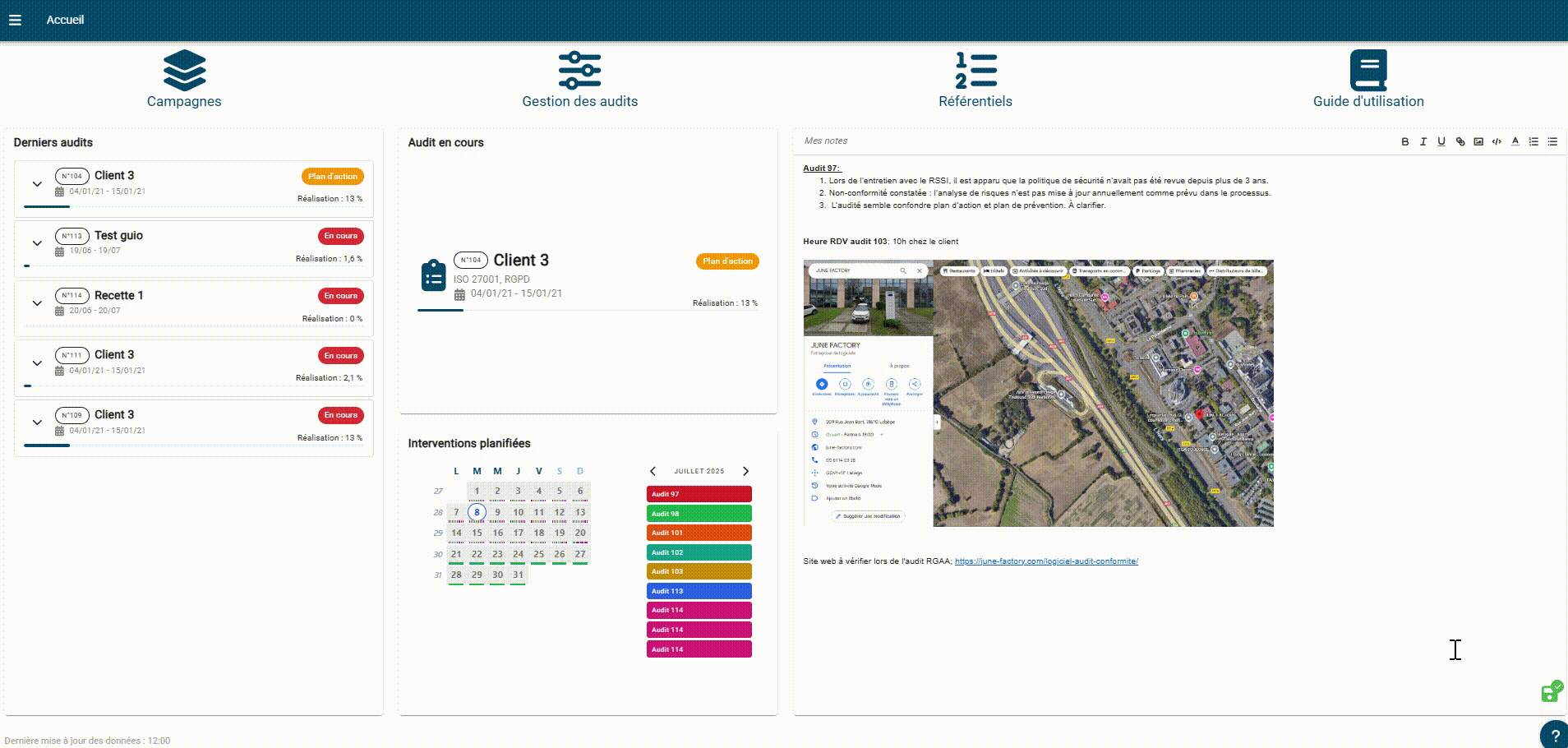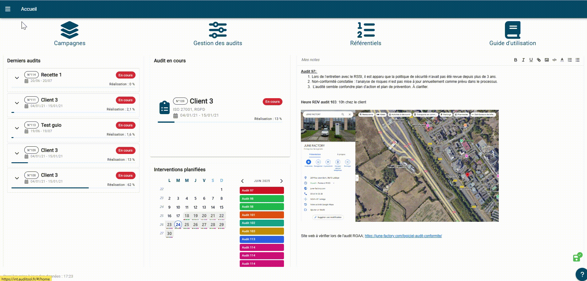 • Bloc agenda intégré pour consulter vos audits planifiés.
