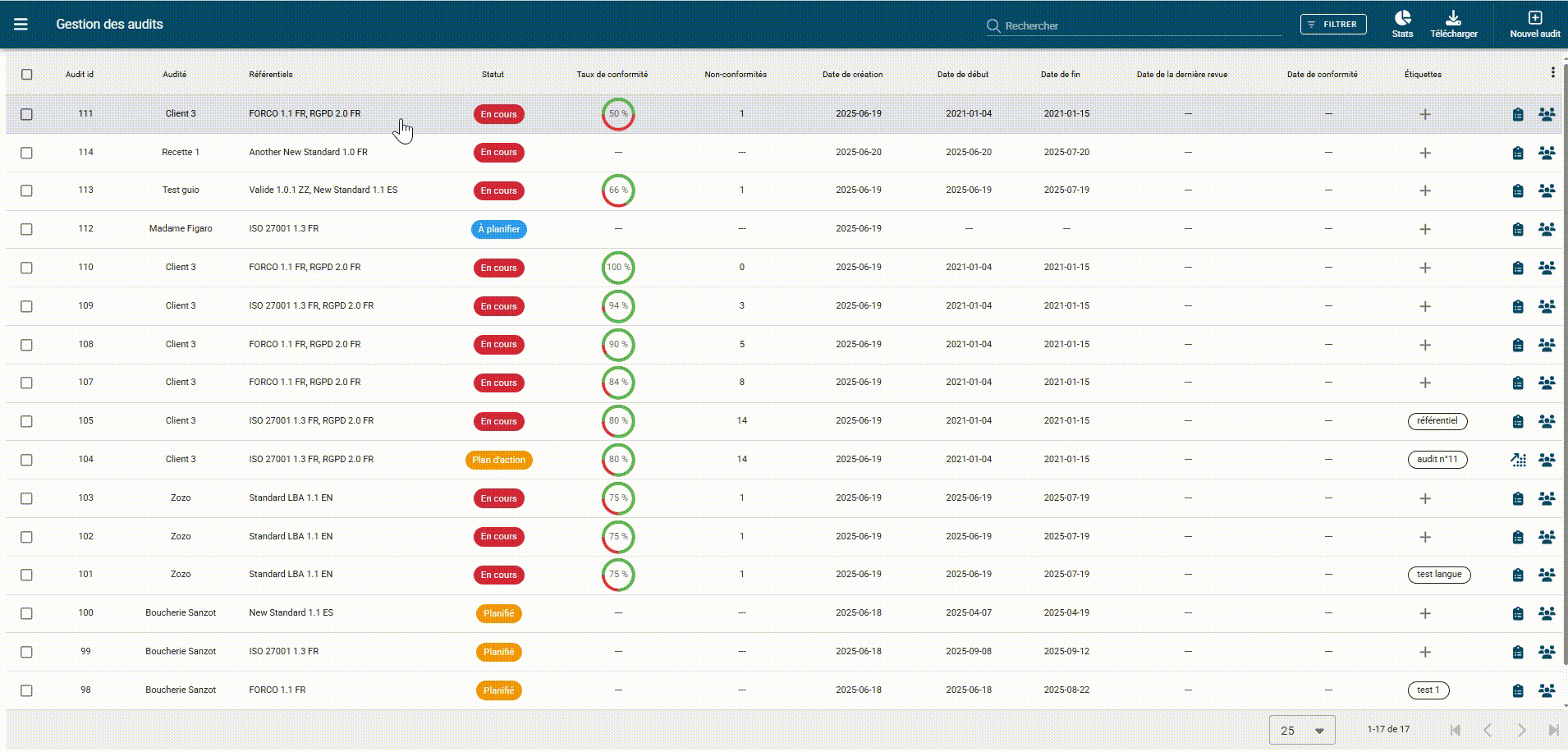 • Nouvelles colonnes dans la gestion des audits : dates (relecture, plan d’action…), nombre de relectures.