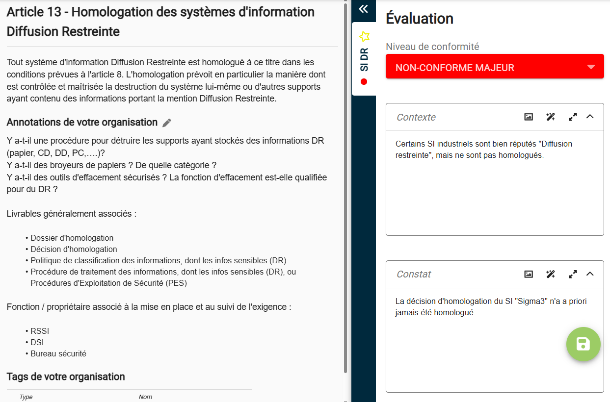Les équipes et prestataires répondent directement dans l’outil et déposent leurs justificatifs à la source. Chaque contrôle est qualifié et documenté, ce qui transforme instantanément les écarts en actions priorisées. Vous obtenez une évaluation claire, homogène et exploitable.