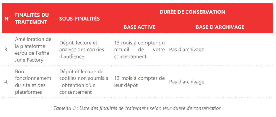June Factory a cartographié ses traitements de données. Les traitements de données réalisés par June Factory sont