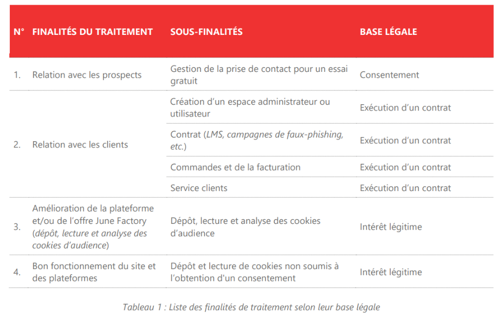 Les traitements mis en œuvre par June Factory sont présentés selon leurs finalités, sous-finalités et base légale dans le